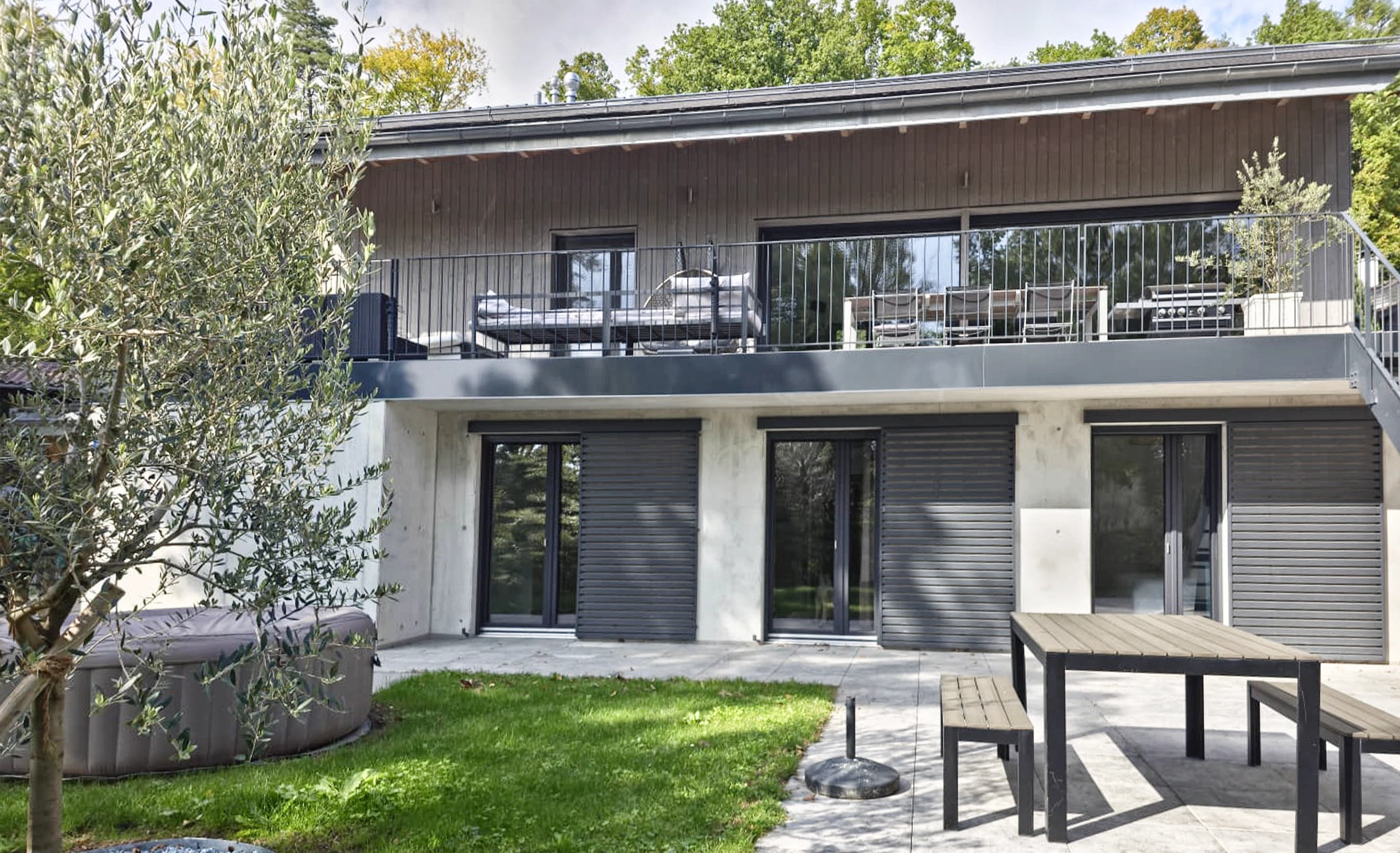 La maison se déploie sur trois niveaux : rez-de-chaussée inférieur, rez-de-chaussée supérieur et combles. Un couvert à voitures permet d’accueillir deux véhicules, directement connecté à l’entrée principale. L’implantation et l’orientation de la construction ont été soigneusement étudiées afin de garantir une intimité maximale entre les habitants et les chalets voisins. Les terrasses et espaces extérieurs sont ainsi pensés de manière à éviter toute communication directe, tout en offrant à chaque famille un espace privé et préservé.